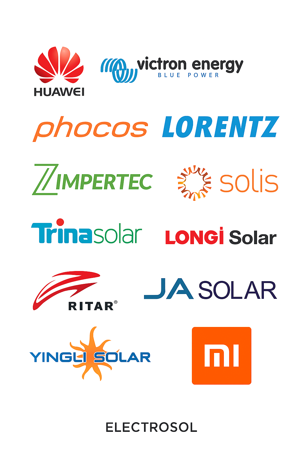 En Electrosol trabajamos con un portafolio de marcas líderes a nivel mundial en tecnología solar. Todos los productos que distribuimos cumplen con certificaciones internacionales de calidad, seguridad y eficiencia energética, garantizando un rendimiento óptimo y una larga vida útil en cada proyecto. Entre nuestras marcas aliadas se encuentran: Huawei, Victron Energy, Phocos, Lorentz, Zimpertec, Solis, Trina Solar, Jinko Solar, Longi Solar, JA Solar, Ritar, Yingli Solar, Xiaomi, entre otras.