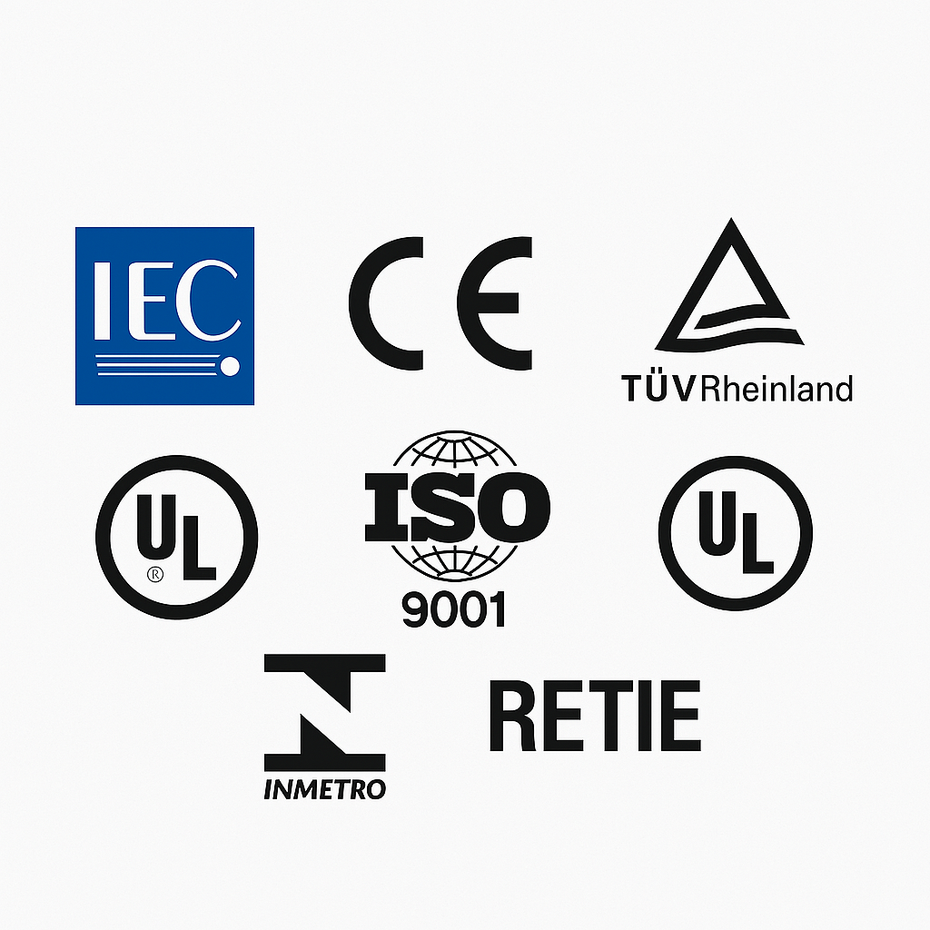 Nuestros proveedores cuentan con certificaciones internacionales como IEC, CE, ISO 9001, TÜV, UL, INMETRO y RETIE.